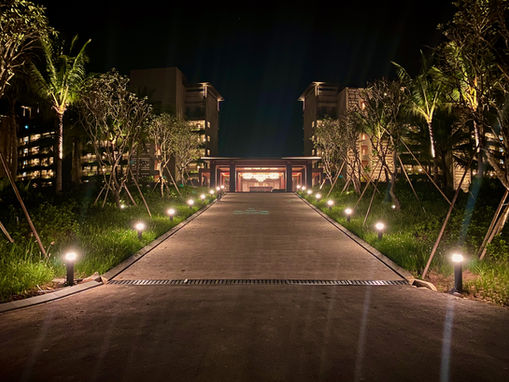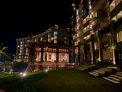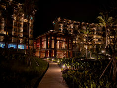 The hotel is located in lush surroundings at the southern tip of Sumatra island. It sits on a 1500m private coastline overlooking the Sunda Straits. The illumination of the exteriors is subtle, with emphasis on textures and natural finishes. The landscape is quietly lit with highlights to the lush foliage and key features.